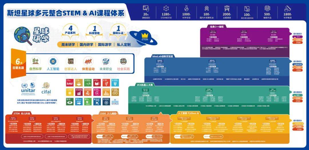 课程体系全面升级,发布多元整合STEM & AI课程体系,推出四大成长路径及两大素质教育产品“ideaLab创新实验室”和“星球研学”。