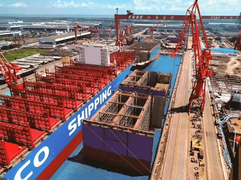 船坞:车览船坞内在建21000箱集装箱船(船体内部截面)、观览龙门吊、高吊、现场平板车等。