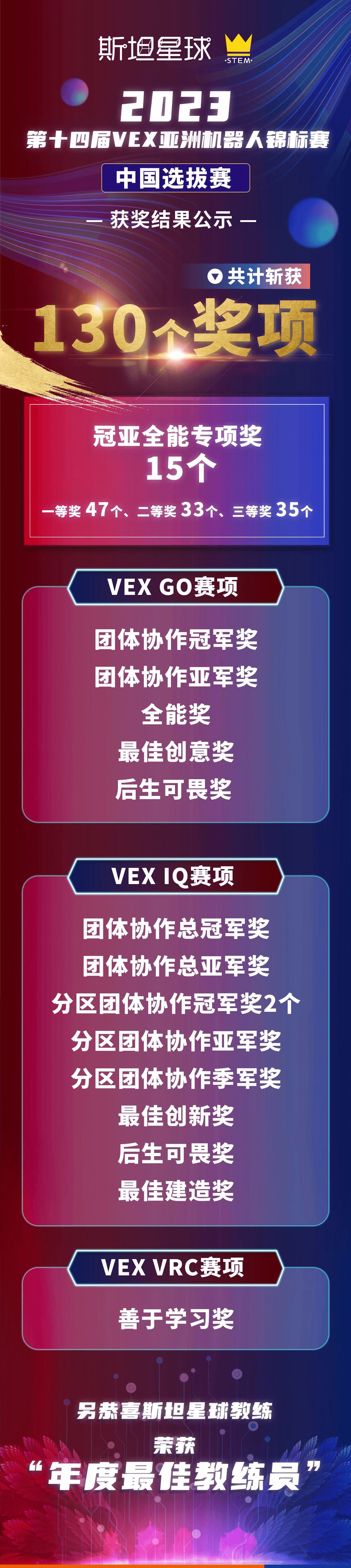 斯坦星球机甲少年气场全开,耀眼如“聚光灯”,豪夺130个奖项,成功斩获包含总冠军、总亚军、全能奖在内的15个重磅奖项,可谓是“一枝独秀”!另外,斯坦星球的翁昊明教练还荣膺“年度zui佳教练奖”。